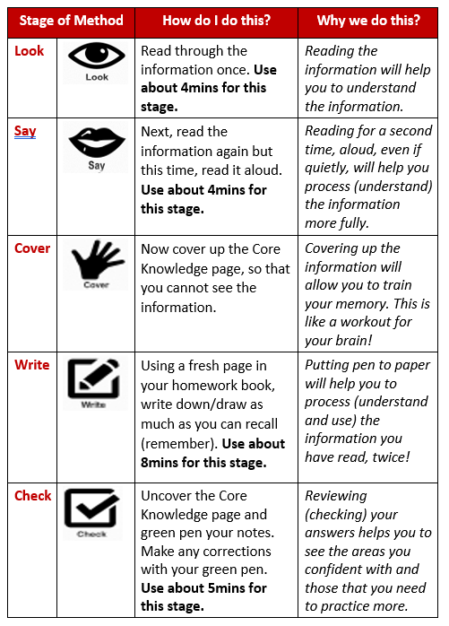 Core Knowledge pages contain the essential (important) information needed for each subject. Knowing and understanding this information, will support you in your lessons and your exams, so that you build confidence and understanding in all subjects. Therefore, your homework will focus upon revising this vital (important) information.