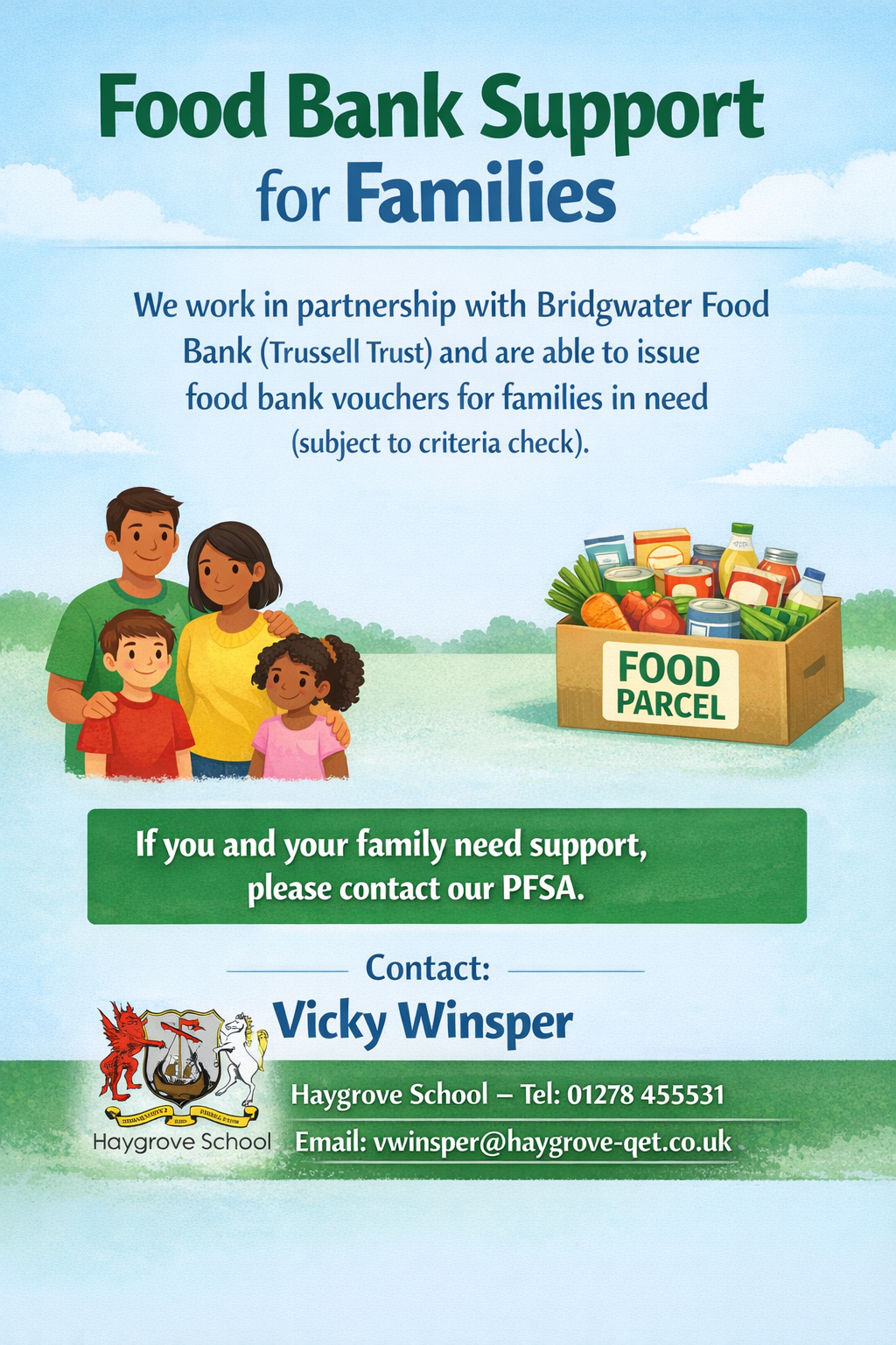 We are here to assist families who may need additional support through the Bridgwater Foodbank (Foodbank vouchers | Bridgwater Foodbank). If you are in need of a Foodbank voucher, please complete the contact form below or get in touch with our PFSA (Parent Family Support Advisor) at school. We're here to help during difficult times.