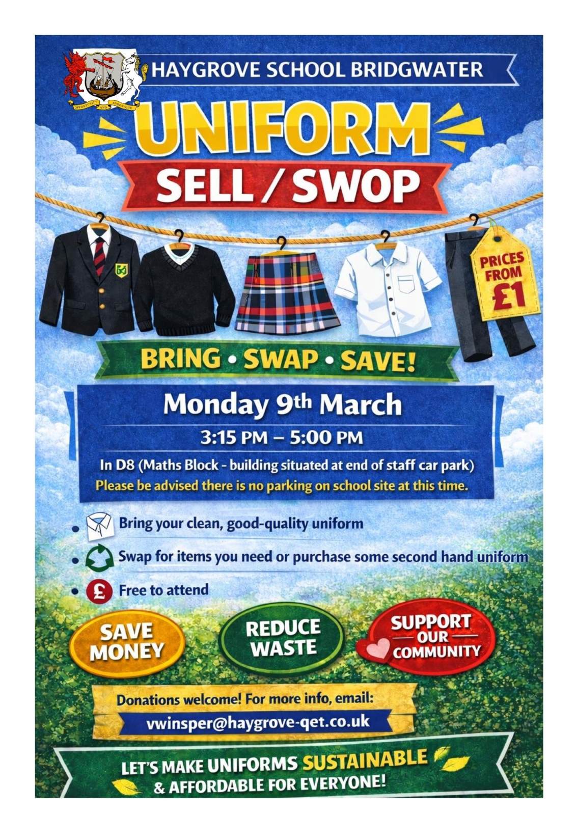 | Monday 9th March, 3.15-5.00pm | Uniform Shop |